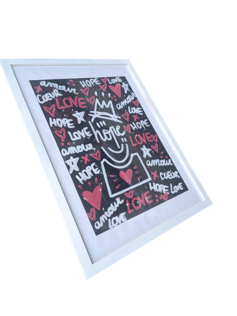 Acrylique sur papier canson noir 224 gr avec cadre en bois peint en blanc
